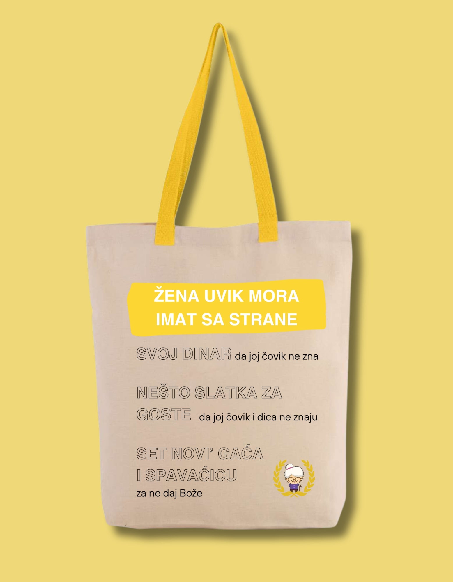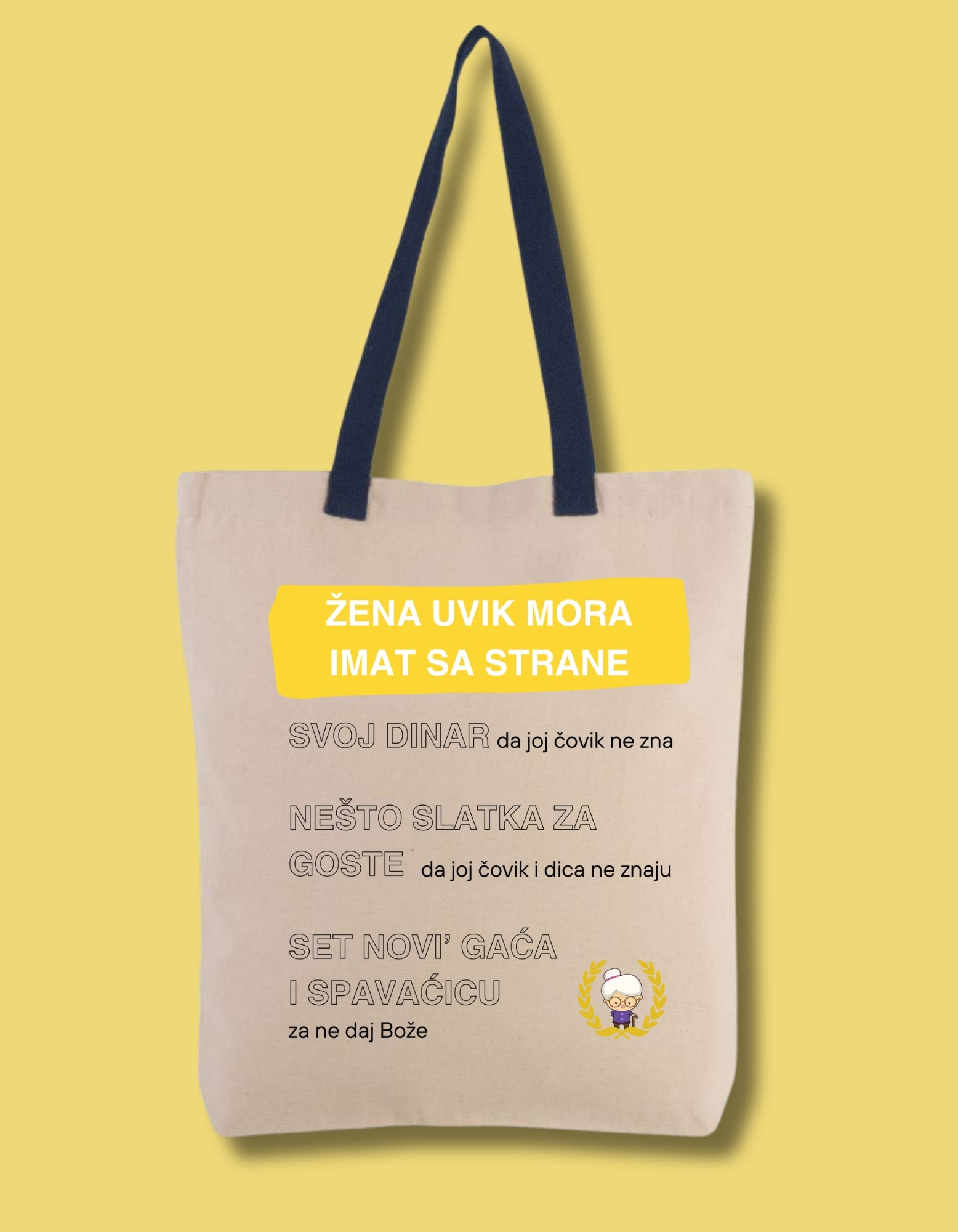 Klasična torba za kupovinu od pamučnog platna s ušitkom pamučne ručke u kontrastnoj boji, dimenzija 42x38x7.